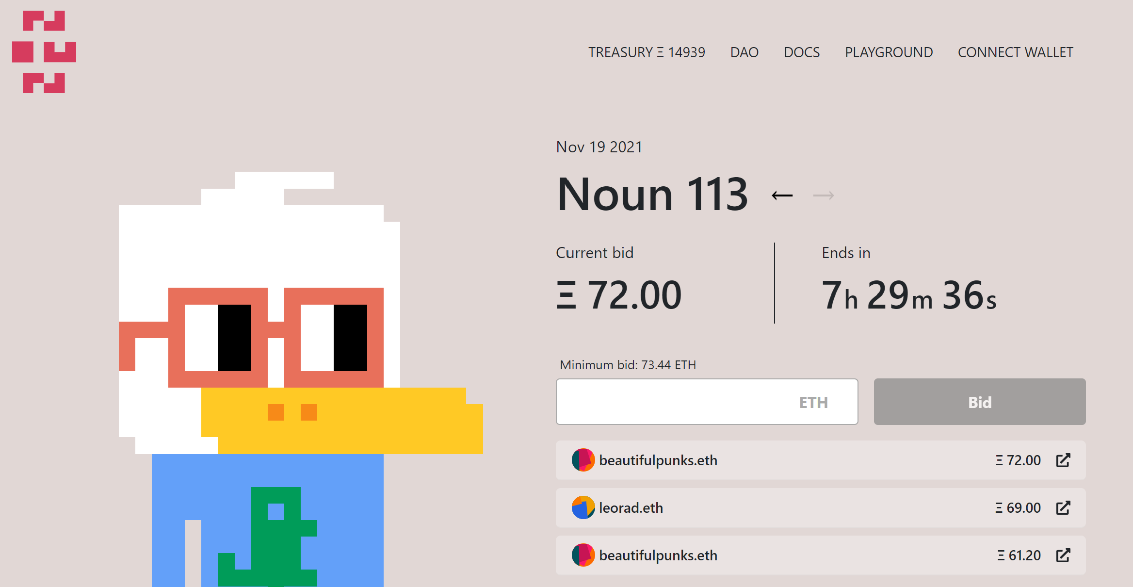They have achieved this by the strange and interesting approach of auctioning one noun, a meme-worthy NFT, like the pixel duck (?) in the image above every day for the past 113 (and counting) days. They plan to do this every day, forever.